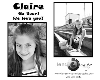 Claire's mommy asked me to do a session of her in her cheer leading uniform and what do you think I said? YES!!! OF COURSE!! :) This was something new for me, but I love that. It keeps my wheels turning, and keeps things fresh. I also had the pleasure of putting together her ad for the football program.